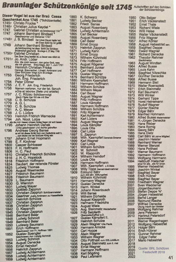 Die Schützengesellschaft Braunlage blickt also auf eine lange Tradition zurück. (siehe Liste Schützenkönge ab 1745 - klick hier - Königsgeschmeide klick hier).