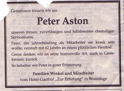 r von 62 Jahren Peter Aston. Es gibt wohl kaum jemanden in Braunlage, der Peter nicht gekannt hat. Dafür sorgte allein schon sein Beruf als Kellner. Meine persönliche Erinnerung an ihn reicht bis in die Schulzeit zurück. Zudem gab es Mitte der 60er Jahre einen Vorfall, bei dem Peter aufgrund seiner gezeigten Zivilcourage meine uneingeschränkte Hochachtung errang. Ihm zum Gedenken habe ich die Geschichte aufgeschrieben. Bitte Foto anklicken!