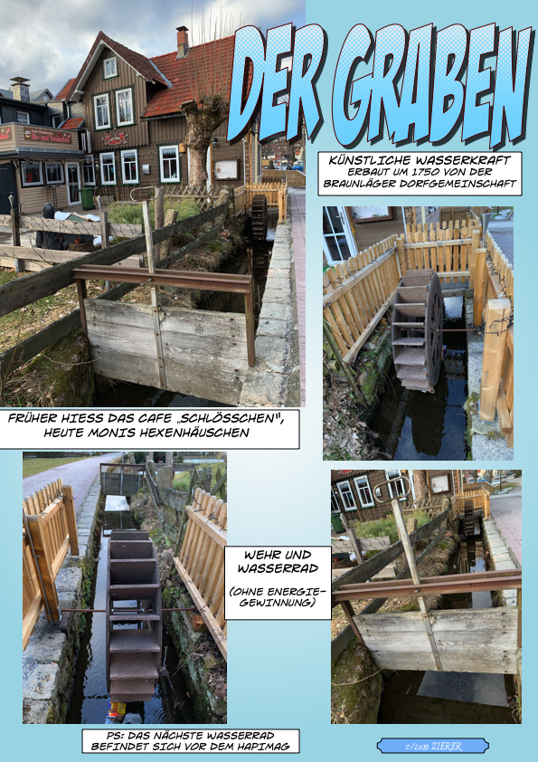 ge wurde der erste künstliche Wassergraben um 1750 angelegt. Der Abzweig "Mühlengraben" wird aus der Bode gespeist und beginnt unterhalb des Eisstadions. Früher sorgte der Graben für den Betrieb der "Mahlmühle" auf dem Gelände der heutigen Neuen Mitte. Danach quert der Bach die Marktstraße und verbindet sich beim Cafe "Monis-Hexenhäuschen" (vormals Schlösschen) mit dem Schultalwasser, ehe das Gewässer vorbei am Hapimag-Resort an der Kolliebrücke zurück in die Bode fließt.
