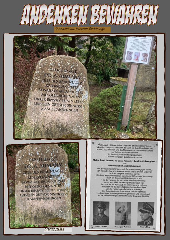 Ein besonderes Anliegen vom Ehrenvorsitzenden der Braunlager Museumsgesellschaft Karl-Günther Fischer ist die Bewahrung des Andenkens an jene Offiziere, welche am 17.April 1945 die Stadt Braunlage durch entschlossenes Handeln und Verhandeln vor Kampfmaßnahmen und einer möglichen Zerstörung bewahrten. Zum Gedenken an den verantwortlichen Stadtkommandanten Dr.Aumann und seine Offiziere initiierte Fischer schon vor Jahren das vor dem Museum aufgestellte Ehrenmal.