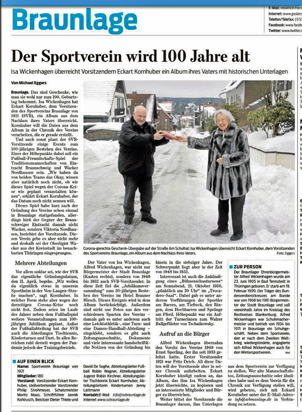 Große Freude löste Isa Wickenhagen im Winter 2021 auch beim Vorsitzenden des SV Braunlage "Ecki“ Kornhuber aus. Sie überließ dem Verein zum 100jährigen Jubiläum die "Goldene Chronik" aus dem Nachlass ihres Vaters Alfred Wickenhagen, die dieser in seiner Eigenschaft als 1.Vorsitzender 1951 zum damals dreißigjährigen Vereinsbestehen mit historischen Ereignissen der zurückliegenden drei Jahrzehnte aufwendig gestaltet hatte. Die feierliche Übergabe wurde von der GZ gebührend gewürdigt - siehe Artikel klick