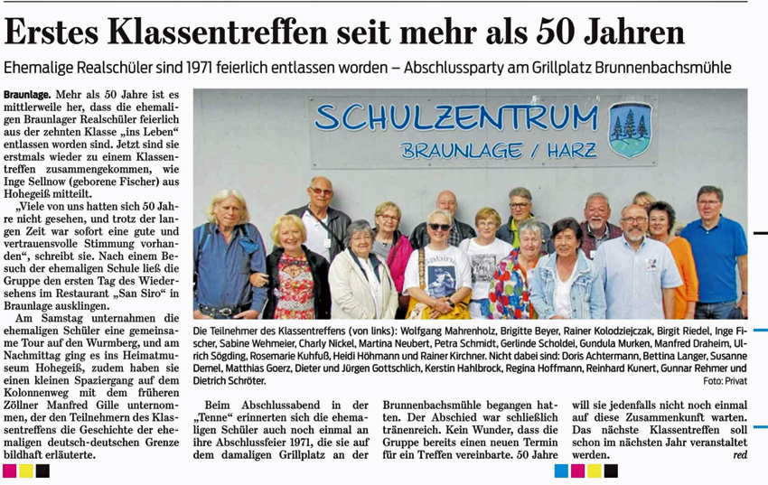 So trafen sich dieser Tage die ehemaligen Schülerinnen und Schüler der 1971er Abschlussklasse der Realschule Braunlage. Ihr Klassenlehrer seinerzeit hieß Hans-Georg Kallwaß, vielen Braunlagern sicher noch bestens bekannt. Über ihr erstes Klassentreffen nach 50 Jahren berichtete auch die Goslarsche Zeitung. Da meine Webpräsenz offenbar gut bekannt ist, bat mich "Klassensprecher" Rainer Kirchner um Veröffentlichung dieses Artikels hier an dieser Stelle. Dieser Bitte komme ich gern nach. Zusätzlich werden noch Fotos von ihrer letzten Klassenfahrt nach Berlin vorgestellt. (Kontakt: rainer.kirchner@web.de)