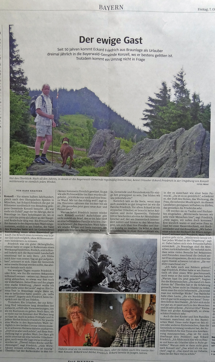 Ecki Friedrich's Gewohnheit jedoch haftet eine Spur Kuriosität an. Denn seit inzwischen 50 Jahren besucht der Braunlager den kleinen Ort Konzell im Bayerischen Wald, um dort zu urlauben, und das regelmäßig dreimal im Jahr. Dort kann er wunderbar ausspannen, wie er es selbst ausdrückt, und Körper und Seele trainieren. Da er gern auch am Leben der Einheimischen teilnimmt, betrachten ihn nicht wenige bereits als einen der Ihren. So sorgten sie auch dafür, dass das diesjährige Jubiläum in der renommierten Süddeutschen Zeitung mit einen ausführlichen Artikel gewürdigt wurde. klick