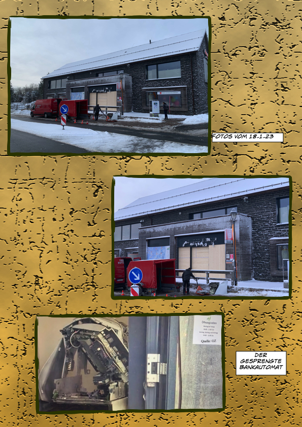 Mit Freund Rolf sprach ich dieser Tage über den Vorgang der Sprengung der SB-Filiale in Torfhaus gegen 2 Uhr nachts. Was passiert, wenn es auf einmal fürchterlich kracht. Du schreckst vermutlich aus dem Schlaf hoch, weißt nicht, ob du geträumt hast, horchst, schaust aus dem Fenster. Und fällt dir nichts unmittelbar Verdächtiges auf, machst du dir erstmal keine weiteren Gedanken. Wird das Ausmaß der kriminellen Tat am nächsten Tag sichtbar, fällst du aus allen Wolken. Und fragst dich, wäre dir nächtens schon irgendwas aufgefallen oder eine Ahnung hätte dich beschlichen, wie hättest du reagiert: mutig, zaudernd, auf andere hoffend…?