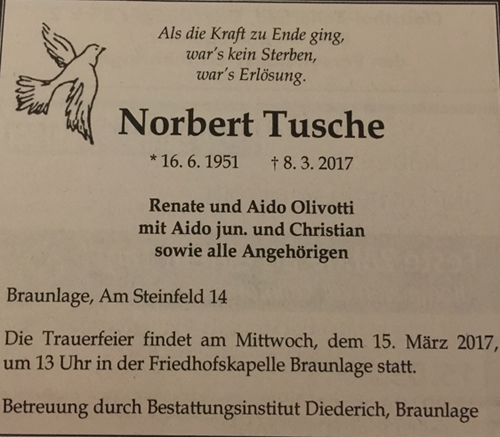 verstorbenen, ehemaligen Wegbegleiter erhält leider einen neuen Eintrag: Nach knapp zweijähriger Leidenszeit erlag Norbert Tusche am 8.März 2017 seiner schweren Erkrankung.
