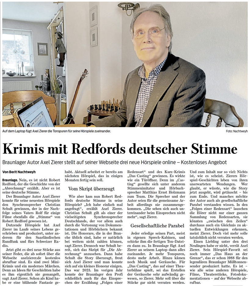 Es verwundert daher nicht, dass sich mir bereits beim Texten von "Die Abrechnung" für den Erzähler die Stimme von Rolf Schult aufdrängte. Leider verstarb dieser vor Jahren. Doch hatte er seinem Sohn Christian nicht nur die Vorliebe für den Schauspielerberuf vererbt, auch beider Stimmen gleichen sich frappierend bis hin zur Verwechslung. Und so synchronisierte nun der Sohn statt des Vaters einige der vorgenannten Weltstars - wie beispielsweise Robert Redford.