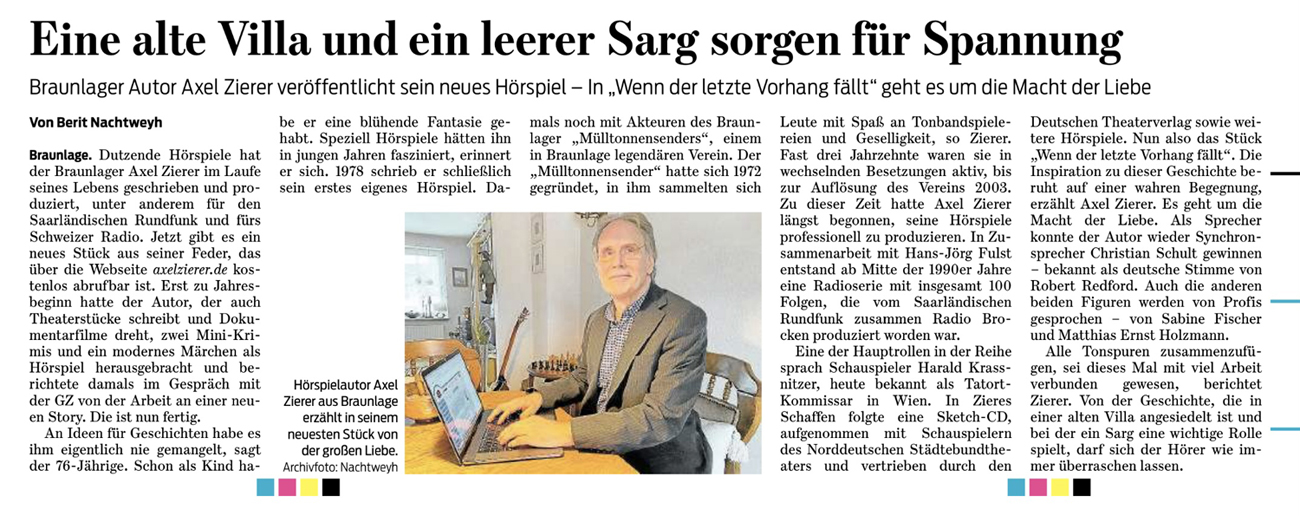 Mein Hörspiel „Das Casting“ schildert die Bewerbung eines alternden Schauspielers um eine Theaterrolle. Der Existenzkampf ist eröffnet - doch drohen neben unterschiedlichen Standpunkten noch weitere Tücken, rein menschlicher Natur! c/2024