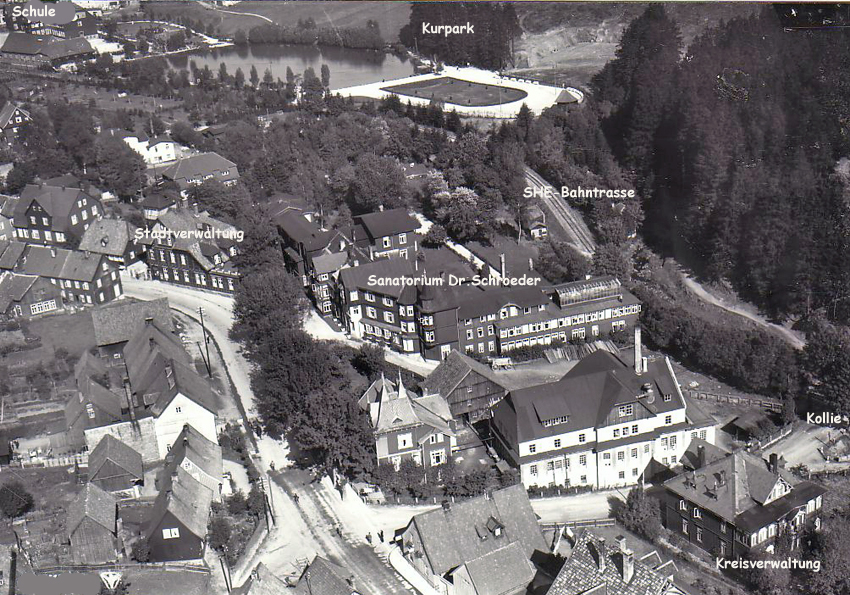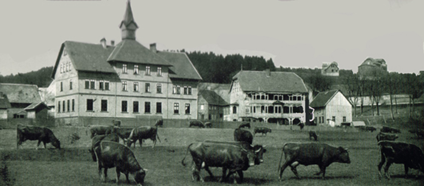 ----------Schule vor 1.Weltkrieg ------- Pferd/Bus vorm Braunen Hirsch 1910 --- Kurgarten 1950---------Steinklippe (oberer Kurgarten)--