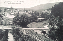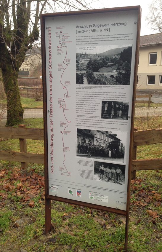 Die nebenstehende Aufnahme zeigt in der Bildmitte die Schienen der Südharzeisenbahn, welche zum Güterbahnhof am Wurmberg führten. Es fuhren Dampfloks und ab 1931 zusätzlich auch Triebwagen mit Dieselantrieb. Hier nähert sich ein Güterzug dem Betrachter vom Wurmberg kommend. Links im Bild ist das Holzlager des Sägewerks Herzberg zu erkennen, welches Rohstoffe wie Produkte von der Südharzeisenbahn transportieren ließ und über einen eigenen Gleisanschluss verfügte. Dahinter das Sanatorium Dr.Vogeler/Dr.Schroeder.