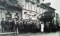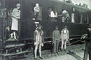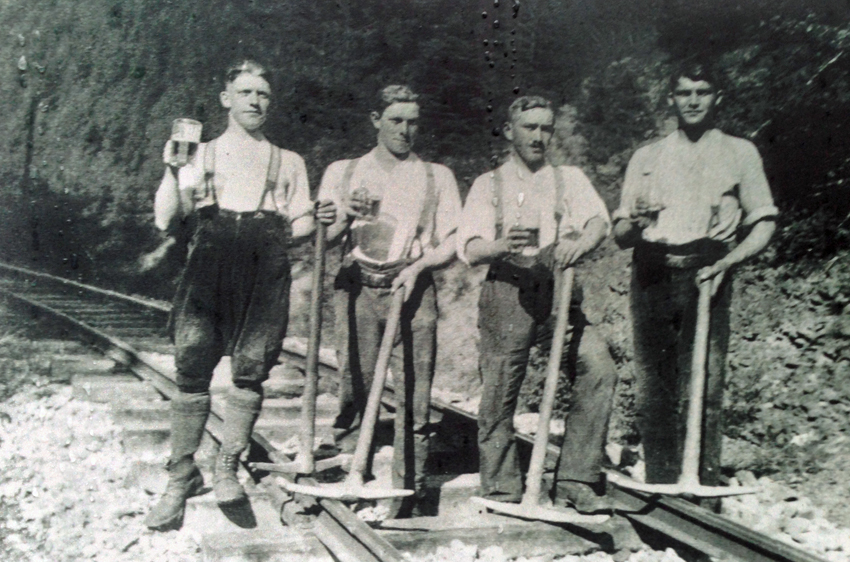 Nicht nur die Mitarbeiter in schmucken Uniformen waren für einen reibungslosen Ablauf wichtig. Gleisbau- und Instandsetzungsrotten, wie hier dieser durstige Vier-Mann-Trupp. Sie waren vor allem nach den Wintermonaten und nach Starkregen im Einsatz.