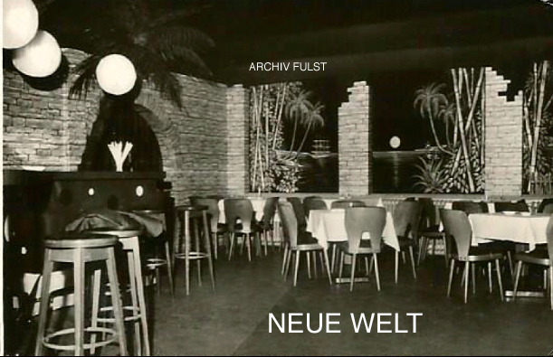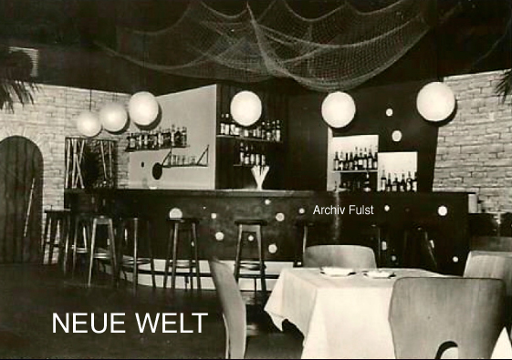 Wenn am Abend der Besitzer Schirrschmidt, der in Figur und Habitus dem Schweizer Bandleader Hazy Osterwald ähnelte, die Schiebetür öffnete, welche Gaststätte von der Tanzbar trennte, dann war es wieder soweit: angesagte Klänge erfüllten die schummrig beleuchteten Räume. Ich erinnere mich noch gut an die kleine Podestbühne an der Hinterwand, rechts davon abgetrennt durch Holzwand und Vorhang der Zugang zu den Toiletten. Gegenüber der Bühne erstreckte sich die lange Theke mit den Barhockern. Auf der Fensterseite standen Holztische mit Sitzbänken in kleinen Nischen, an deren Ende sich ein Windfang mit Ausgang zur Strasse befand. Angesagte Bands gaben hier Gastspiele, stellvertretend seien hier Casey Jones & The Govenors (Don't ha ha) oder die "JPs" genannt, die später als "Jane" große Erfolge feierten. Später kamen bekannte deutschsprachige Künstler hinzu. Selbst der große Udo Jürgens konnte zu Beginn seiner großen Karriere in der "Neuen Welt" bestaunt werden.
