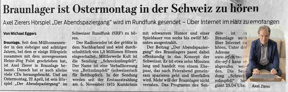 Seit Ostermontag, 22.4. 2019 kann ich mich auch zum erlauchten Kreis der internationalen Autoren zählen, die für das „Schreckmümpfeli“ tätig sein dürfen. Titel meines ersten Krimis: „Der Abendspaziergang“