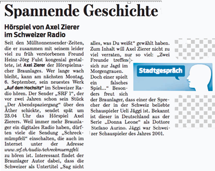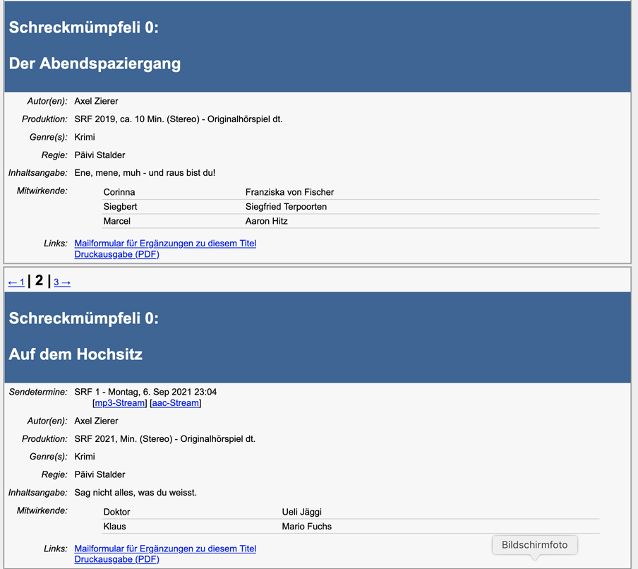 Im Schweizer Rundfunk gibt es seit 1975 ein Sendeformat, das inzwischen Kultstatus erreicht hat: die Krimi-Kurzhörspiele unter dem schrulligen Titel „Schreckmümpfeli“. Jede Woche am Montag quietscht beim SRF 1 zu später Stunde bei einer eingefleischten Fangemeinde eine singende Säge das Brahms’sche Wiegenlied als Erkennungsmelodie und kündigt eine weitere Folge von teuflischen, gruseligen und abstrusen Geschichten an. Der Phantasie der Autoren sind kaum Grenzen gesetzt. Und so starten die kultigen, ironischen und fiesen Kurzkrimis ohne falsche Rücksicht auf moralische Zwänge oder „political correctness“ in den Äther.