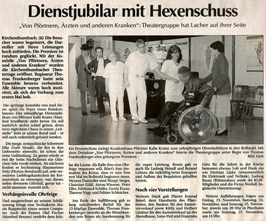 Premiere im November 2007 zum Auftakt der Kirchenthumbacher Theaterwochen. Die schwungvolle Inszenierung von Regisseur Thomas Frankenberger begeisterte das Publikum. Siehe Rezension.
